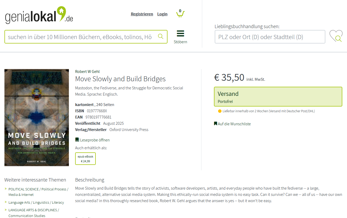 Das Buch „Move Slowly and Build Bridges: Mastodon, the Fediverse, and the Struggle for Democratic Social Media“, Robert W. Gehl, Oxford University Press, August 2025