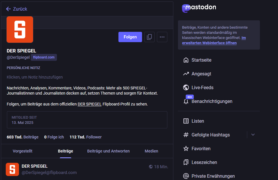 Die News-App Flipboard bringt viele bekannte Medien auf Mastodon. Frühzeitig wurde die ActivityPub-Technologie integriert, so dass die Inhalte der Publikationen ganz normal über die Profile der Medien erreichbar sind. Das steigert die Attraktivität von Mastodon bedeutend.