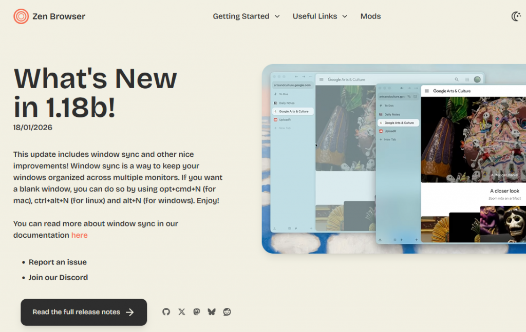 Zen synchronisiert jetzt Fenster auf demselben Gerät, sodass Änderungen in einem Fenster sofort in allen anderen Fenstern übernommen werden. Beim Erstellen eines neuen Fensters wird automatisch dein bestehender Bereich geöffnet und alle vorhandenen Registerkarten angezeigt.
